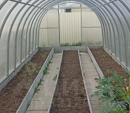 За домом находится теплица 8 м., пол в которой выложен брусчаткой, имеется хоз. блок.