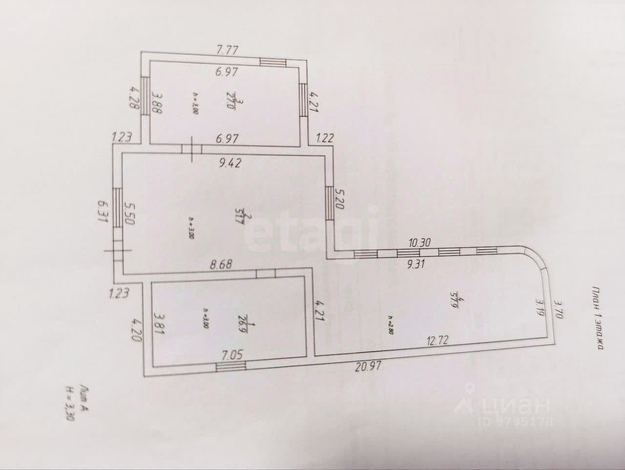 Просторная гостиная-кухня, отдельная гостиная, две спальни, санузел и техническое помещение.