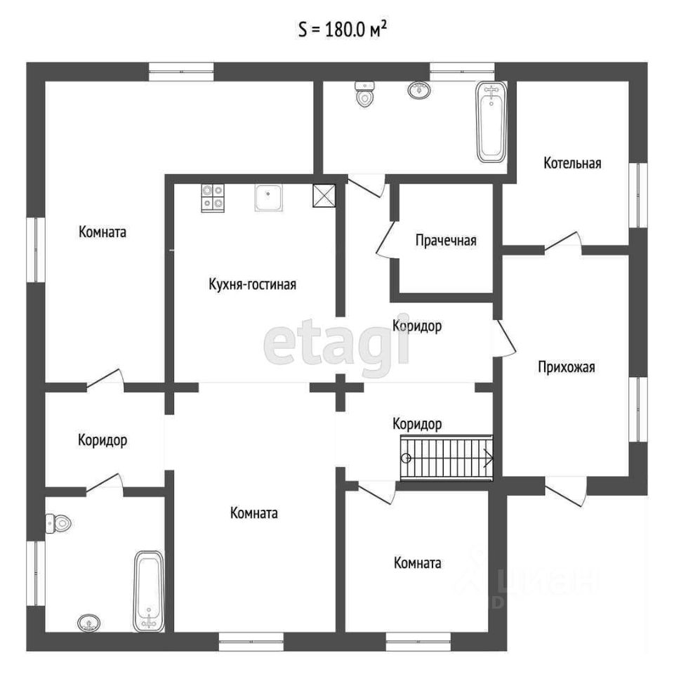 1 этаж: 2 спальни, 2 санузла, зал, кухня, прачечная, бойлерная, коридор.