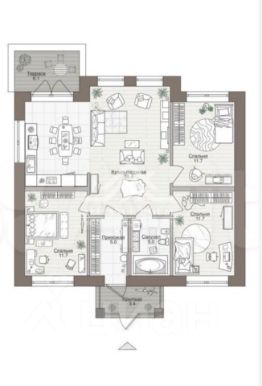 Входная группа, просторная кухня-гостиная, 3 спальных комнаты, 1 санузел