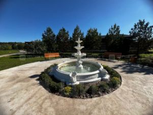 • Детская площадка и прогулочная зона с фонтаном у реки.