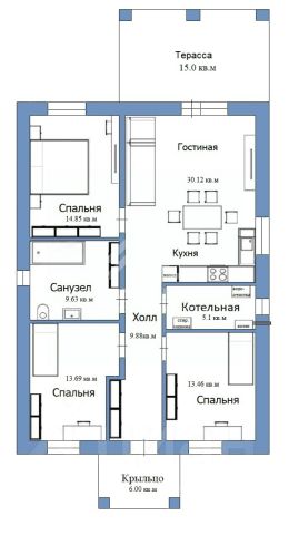 Входная группа, прихожая, котельная комната, просторная кухня-гостиная с выходом на террасу, 3 жилые комнаты, большой санузел;