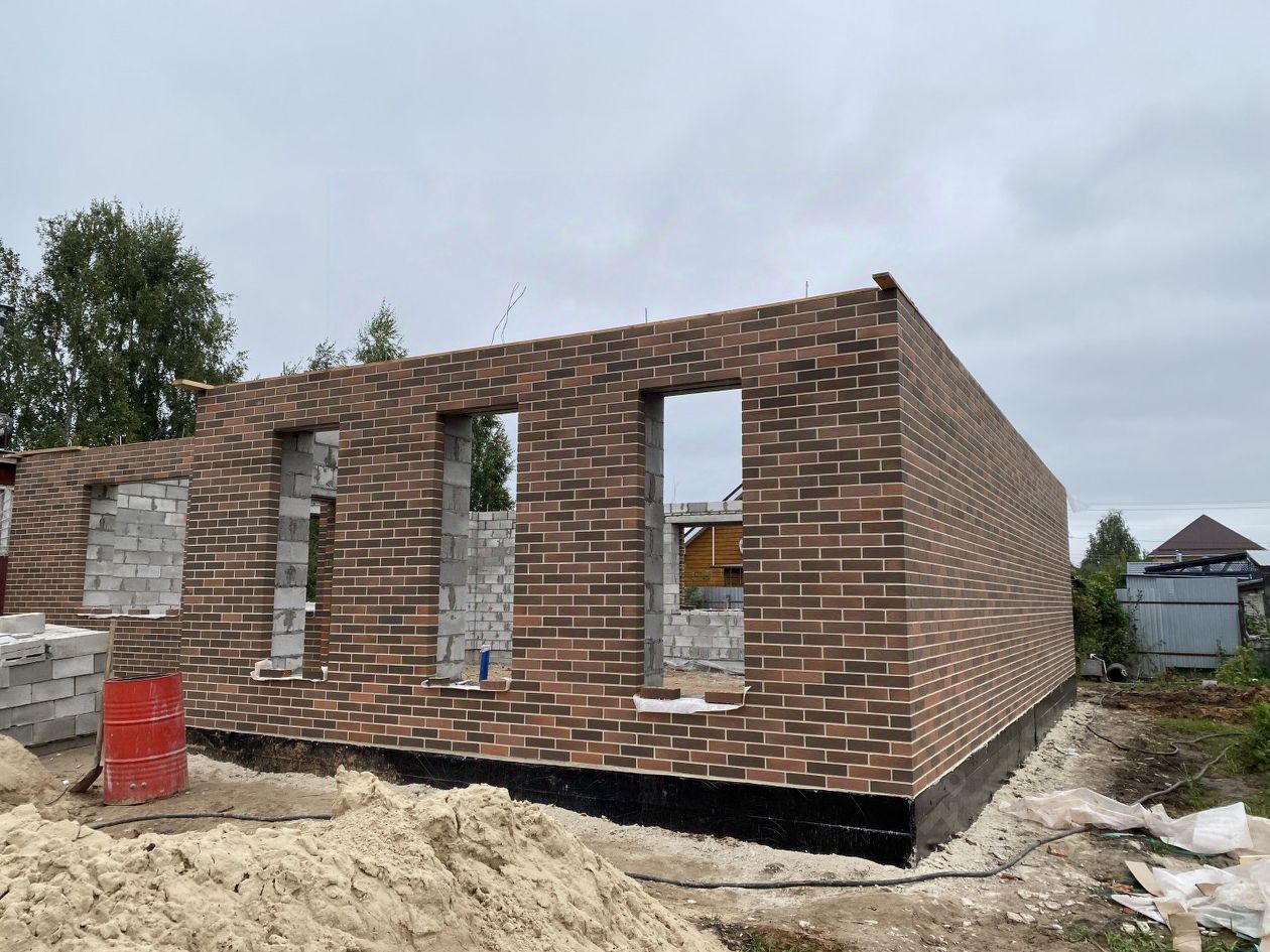 Стены: Теплый контур — керамзитобетонные блоки в 2 слоя + облицовочный кирпич.