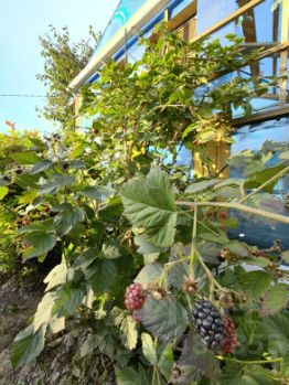 На участке посажены различные декоративные, плодовые и ягодные кустарники: яблоня, груша , вишня, слива, смородина, крыжовник, ежевика и клубника.