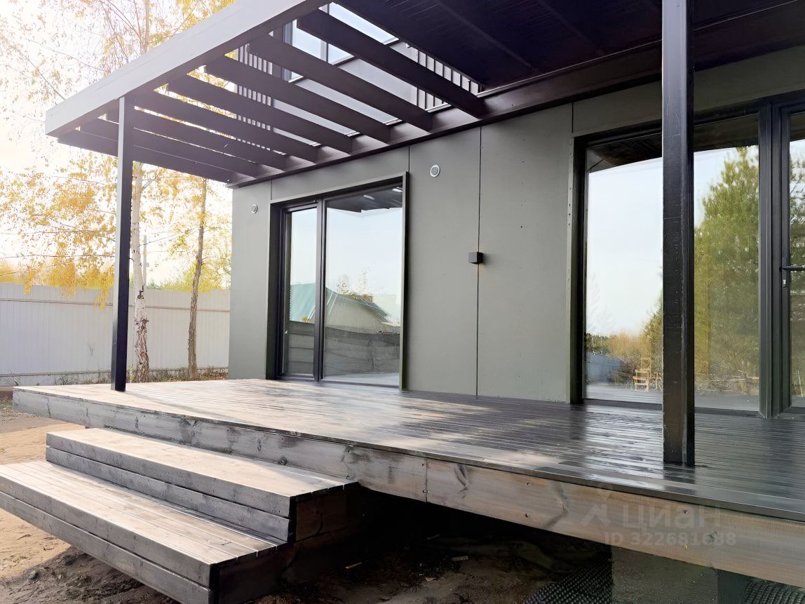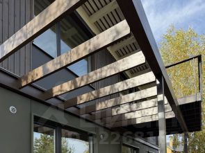 Дом имеет приватную и открытую часть, незагромажденную забором, с удобным заездом. Большие летние помещения на приватной стороне открывают вид на участок в 10 соток, на котором расположились большие сосновые деревья. Нам удалось вписать дом, не спилив ни одного дерева, и мы требуем, чтобы новые хозяева сохранили эту заповедную красоту.