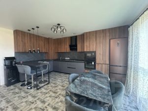 Стены - венецианская штукатурка, натяжные потолки, на полу керамогранит и плитка( полы теплые по всему дому).