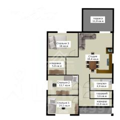 Входная группа, холл, просторная кухня-гостиная с выходом на террасу, три жилых комнаты, большой санузел, гардеробная;