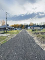 Асфальт до въезда в поселок, в самом поселке асфальтная крошка. На КПП охрана.
