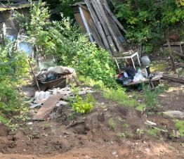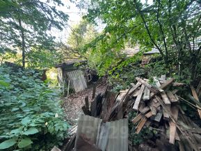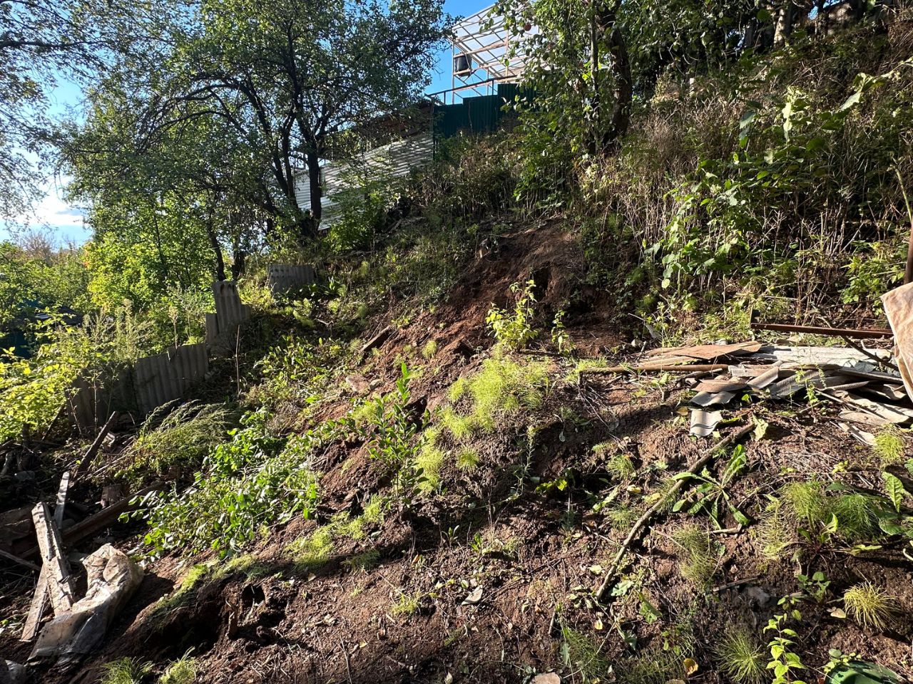 Участок каскадной формы , как бы в углублении . Старый дом снесли. Остался сарай .