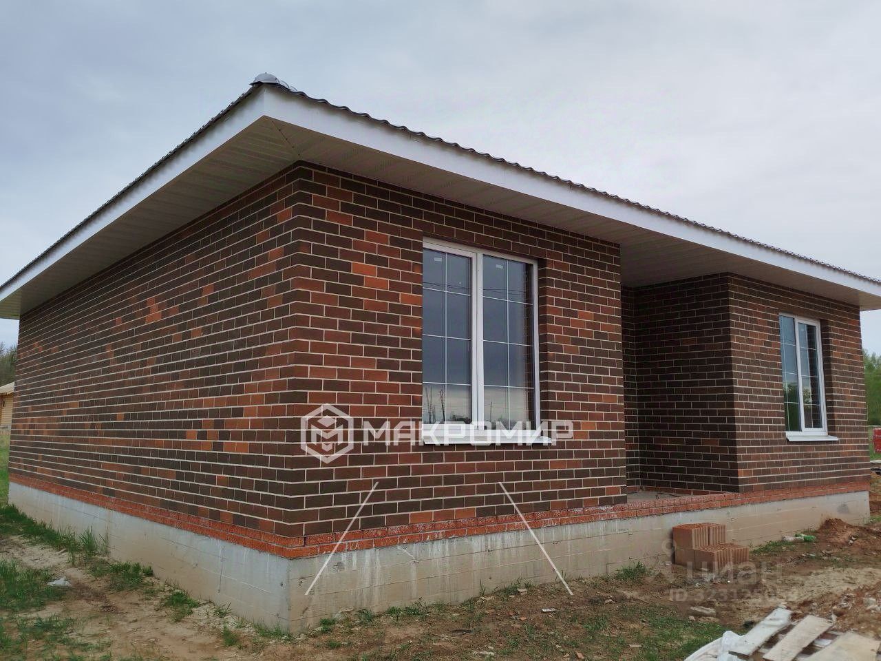 Планировка дома три комнаты: изолированные спальни и гостиная с панорамным окном, бытовые помещения, участок 976 кв.м. (земли населенных пунктов).