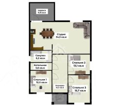 Входная группа, просторная кухня-гостиная с выходом на террасу, 3 спальных комнаты, санузел, гардероб, котельная