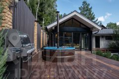 Банный комплекс с философией: Баня с хамамом, японская бочка фурако на террасе и зона барбекю для долгих вечеров в кругу близких.