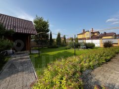 Участок с ландшафтным дизайном, посажены декоративные растения, кустарники и деревья, дорожки выложены камнем брусчаткой. Все свободное пространство выровнено и засеяно газоном.