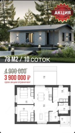 Акция до 31.01.2026г. Дом 78 м² на участке 10 сот. Всего за 3 900 000. участок 650 000.