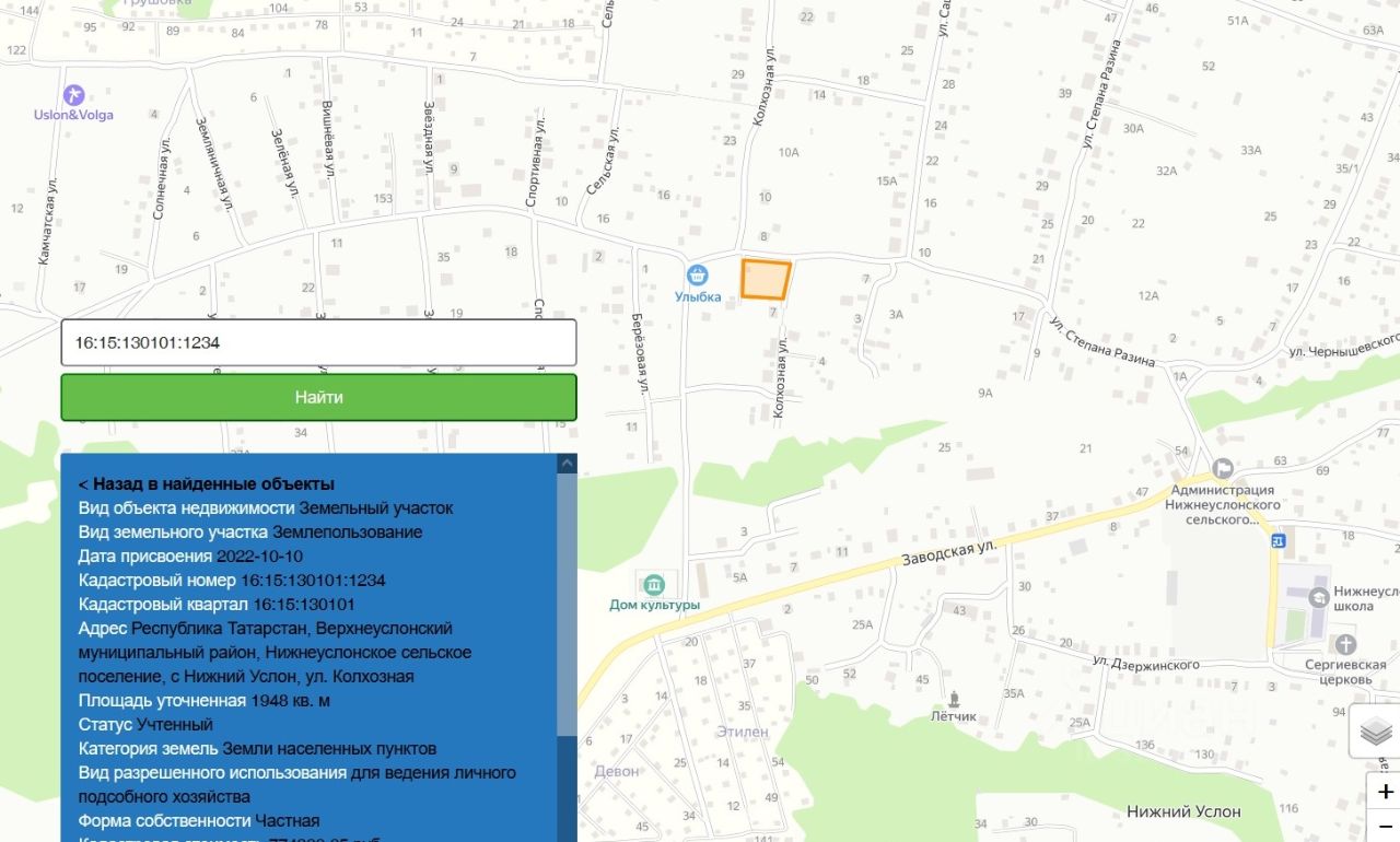 Участок на Волге,сельское поселение Нижний Услон,экологически чистый район. Электричество подключено,вода,газ вдоль участка,огорожен забором. Хорошие подъездные пути- асфальт до ворот,зимой дорогу чистят. Тихое место. До Казани на авто 40 мин. Кадастровый номер 16:15:130101:1234. На участке есть деревянный летний домик,теплица, железный гараж. Участок ровный, квадратный,плодородный,в перспективном районе,часть его засажена плодовыми деревьями и кустарниками,саду 30 лет. В поселке есть все необходимое: магазины, школа,садик. В 10 минутах пешком находятся две пристани (ходят теплоходы) и хороший песчаный пляж. Участок идеально подходит для строительства загородного дома: ровная форма подойдёт для реализации любого проекта. Хорошие соседи.
