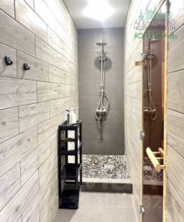 1 этаж: Просторная кухня-гостиная, зона отдыха, гостевой санузел, душевая, ванная, сауна, спальня и главная жемчужина — большая остеклённая терраса с камином. Здесь вас ждёт добротный большой стол, созданный для шумных праздников и тёплых семейных ужинов в любой сезон.
