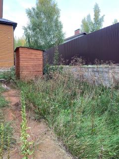 Участок общей площадью 5,4 сотки имеет удобную Г-образную форму с длинным, независимым заездом через кованые черные ворота, что исключает проезд через чужую территорию. На участке без труда размещаются три автомобиля, что является большим плюсом для семей, часто принимающих гостей. Грузовые автомобили также имеют удобный подъезд. Четыре сотки участка отведены под плодоносящий сад-огород с малиной, кустарниками, вишней, сливой, яблонями и даже лесной земляникой. Электричество подведено по земле, с возможностью прокладки по верху после установки забора. Установлен септик, который требует минимального обслуживания (откачивался всего 3 раза за весь период). Также имеется хозблок для хранения.