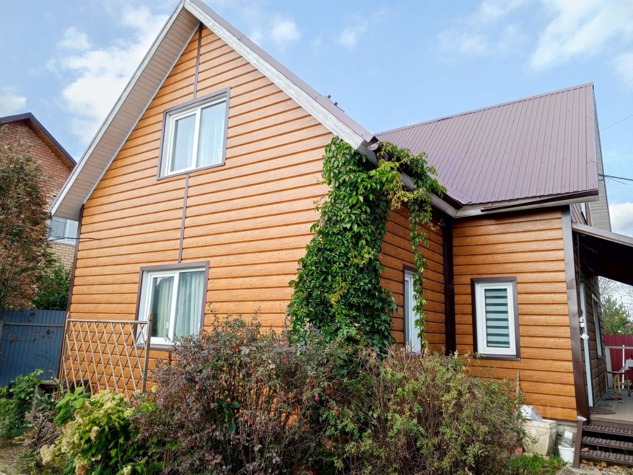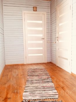 Снаружи дом утеплен и обшит сайдингом с имитацией под брус. Вокруг дома сделана отмостка. Пристроена просторная терраса- прекрасное пространство,чтобы встречать утро с чашкой кофе или провожать закат под бокал вина или вечерний чай,посидеть с книгой или с любимыми домашними питомцами.Развести на нем оранжерею или установить качелю- кокон. Поставить стол с креслами для приема гостей