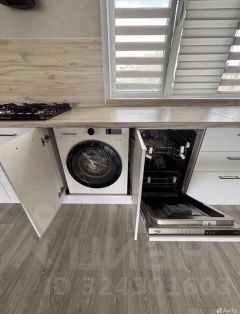 Новый кухонный гарнитур со встроенной техникой ( духовая печь, микроволновая печь, стиральная машина, посудомоечная машина, холодильник, варочная поверхность, вытяжка), стол