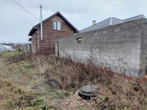 По периметру участка установлены столбы для забора. Перед домом построена коробка гаража 12х4