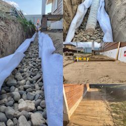 - По периметру отмостки смонтирована дренажная труба (есть фото), уложенная в речной камень с геотекстилем.