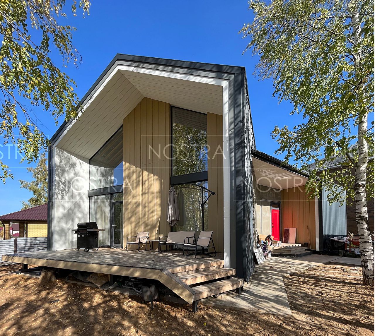 -Терраса, парковочное место с навесом и отапливаемым хозблоком, ЗАБОР, отмостка, врослые деревья на участке.