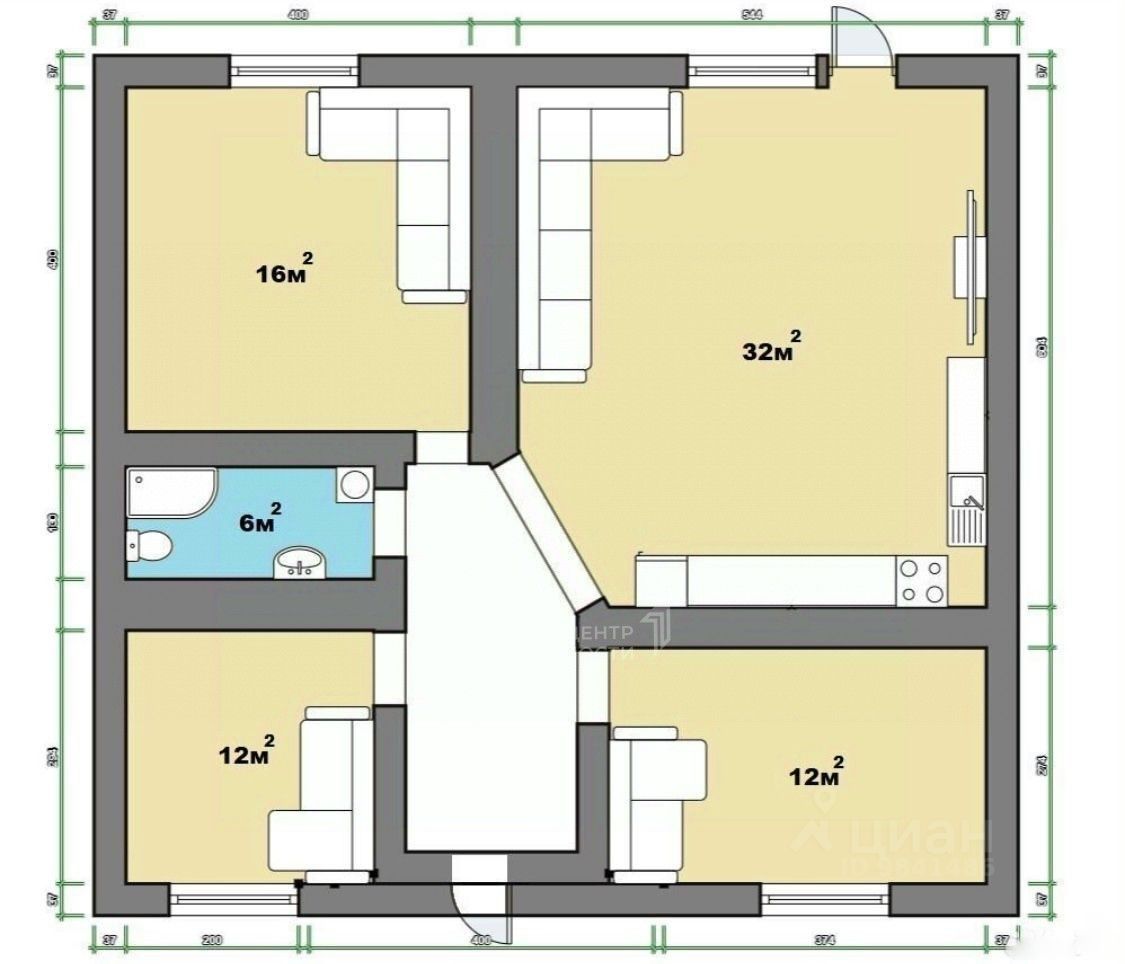 Кухня-гостиная 32м² и три изолированные комнаты ( 16+12+12 м² )