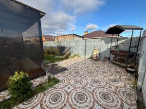 Уложена брусчатка Во дворе посажены плодовые Деревья, Туи.