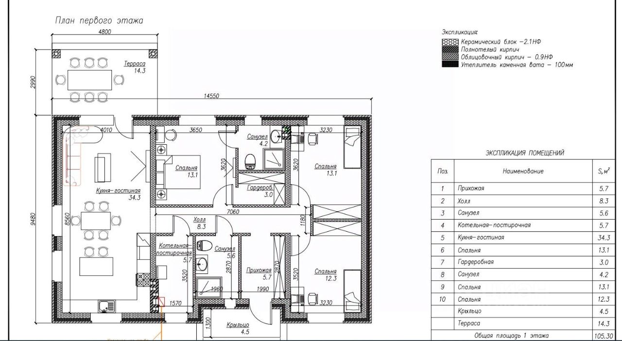 В доме расположены: крыльцо, входная группа, холл,санузел, котельная-гостирочная, кухня-гостиная, 3 спальни, гардеробная, терраса. Общая площадь дома 105,3 квм. С учетом террасы 124,10 кв м.