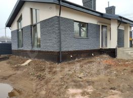 -Утеплитель минеральная вата плотностьо 75кг/м3-100мм вентзозор, облицовочный кирпич 1.4 НФ. Финишное покрытие фасада из колотого силикатного кирпича со вставками металлосайдинга (под планкен).