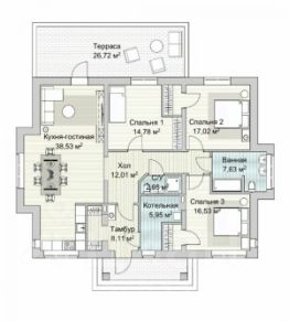 Входная группа, прихожая, 3 спальные комнаты, шикарная кухня-гостиная с отдельными зонами, с/у;