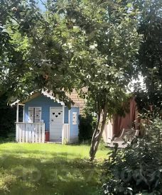 Имеется сад с рослыми деревьями - яблони, груши, вишни, голубые ели по периметру участка;