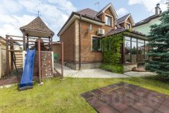 На участке личная детская площадка с белым песком.