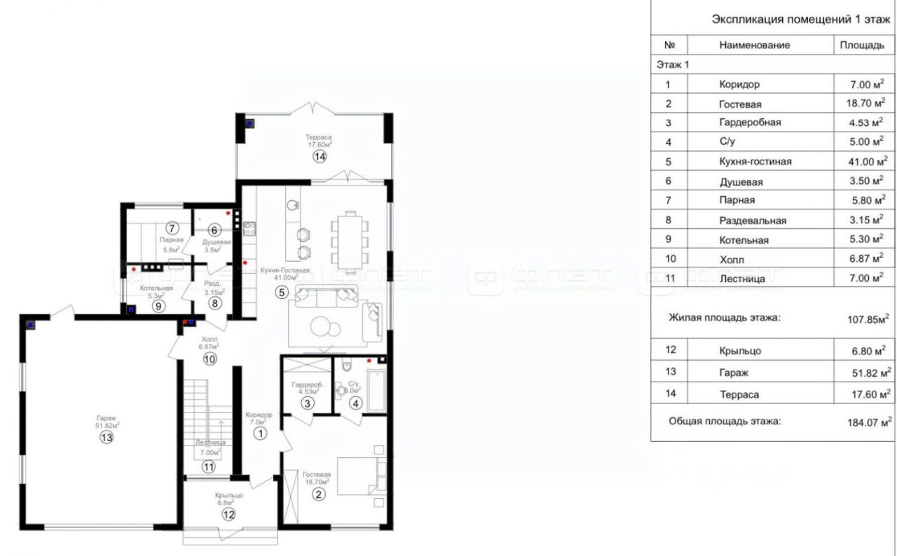 - кухнягостиная: 41 кв. м — просторная зона для семейных посиделок и приёма гостей;