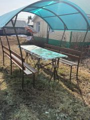 Планировка участка хорошо продумана: здесь расположены баня, готовый к использованию гараж и хозяйственные постройки, а также обустроенная зона отдыха с беседкой.