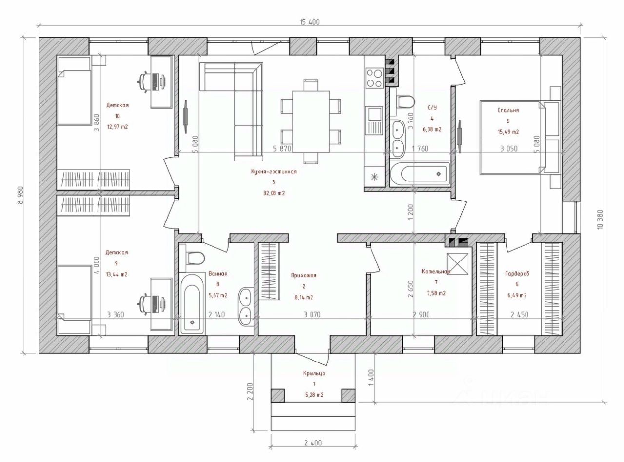 Дом построен из качественных материалов, имеет грамотную продуманную планировку и большие панорамные окна.