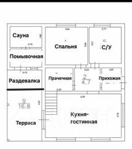 Кухня-гостинная,Спальня,Совмещенный санузел( Ванна и душ), Подсобная комната,соединенная с прачечной., Тёплая терраса,предбанник,помывочнвя,сауна.