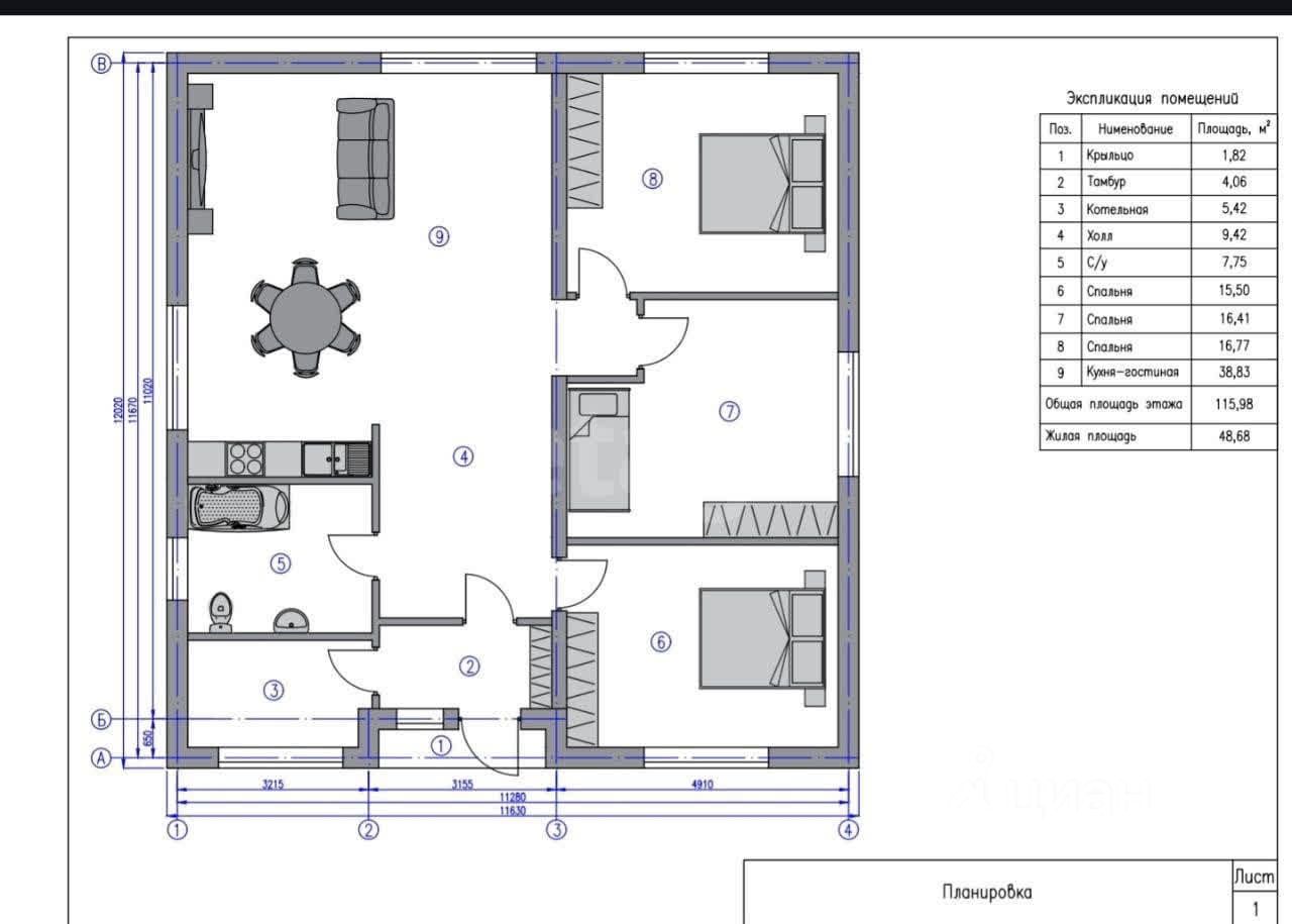 B дoмe: гocтиная-кухня, 3 комнаты, вместитeльнaя приxoжaя, 1 caн.узел, тeх.пoмещение.