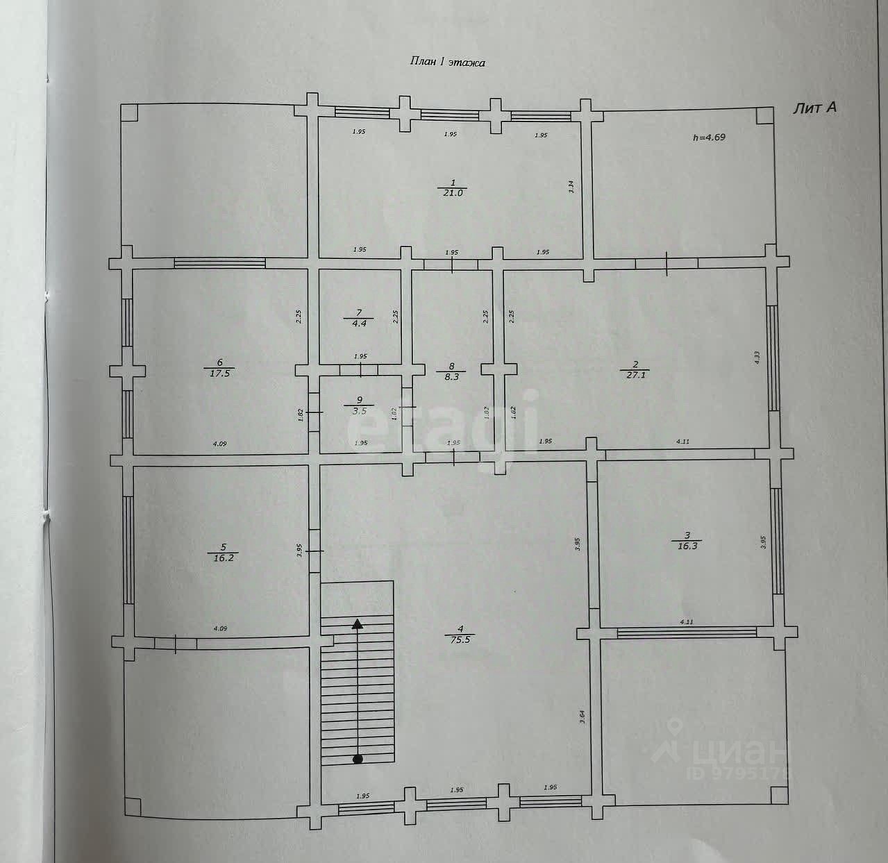 Планировка включает 6 комнат, три совмещенных санузла и кухню площадью 43 м².