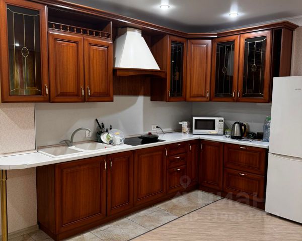 Стильный кухонный гарнитур, оснащён варочной панелью, духовым шкафом, вытяжкой, а также имеется посудомоечная машина, микроволновая печь, электрический чайник, двухкамерный холодильник, сушильная машина и стиральная машина;