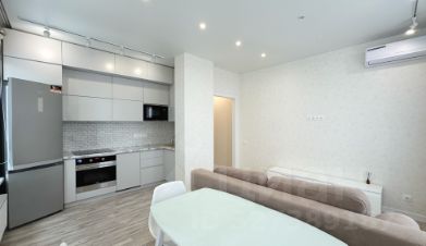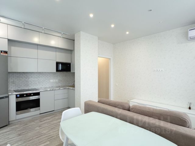 Зал совмещен с кухней, кожаный диван, большой круглый стол.