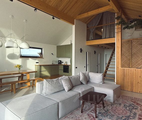 На первом этаже расположены санузел, отдельная спальня и большая гостиная, совмещенная с кухней. На втором этаже 4 комнаты.