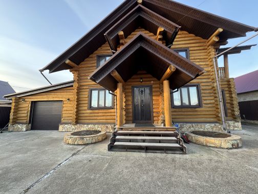 Деревянный экологически чистый сруб , 2 этажа . отдельная баня и сад . Баня выполнена тоже из сруба . Дом дышащий , аромат дерева . Летом сохраняет прохладу без кондиционеров , зимой регулируемая температура внутри . Деревянные двери , лестница . Полы из пробкового дерева . Кухня из массива , полностью оснащенная итальянской бытовой техникой в стиле классик . Гараж с котельной также из сруба соединены с домом . достаточно места для хранения снегохода , велосипедов , квадроциклов и другой техники . Цветущий сад с розами , гортензиями , лилиями . В шаговой доступности вся инфраструктура: магазины , детский сад , школа , банк , заправка , кафе , аптеки , фермерские магазины с натуральными продуктами .