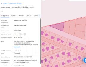 Данные получены с сайта ГИС Торги. Земельный участок с кадастровым номером 16:24:240201:1820, вид разрешенного использования для индивидуального жилищного строительства (код 2.1) из земель населенных пунктов, общей площадью 1000 кв.м., расположенный по адресу: Р...