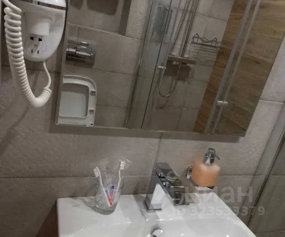 В ванной комнате: косметическое зеркало, фен, душевая кабина, туалетные принадлежности.