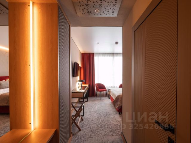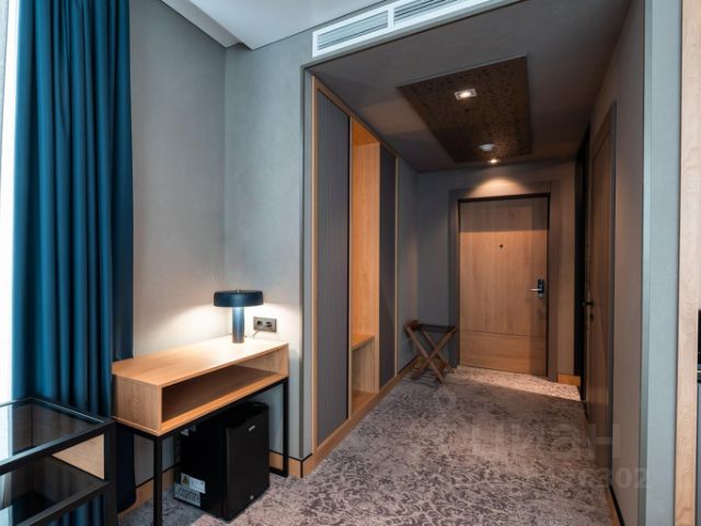 Кухонная зона оборудована всем необходимым: варочная панель, микроволновая печь, холодильник с морозильной камерой, посуда. Вдобавок ко всему, просторная гардеробная комната позволит хранить большой объем вещей. Все номера категории расположены на 2 этаже.