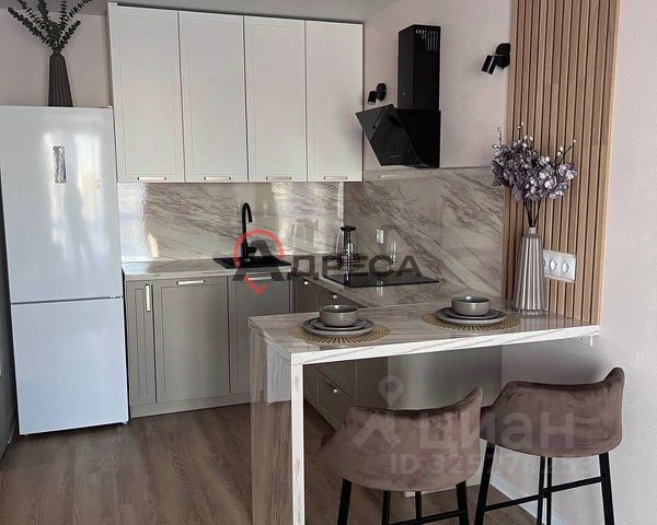 ПРО КВАРТИРУ: Стильный кухонный гарнитур, оснащён варочной панелью, вытяжкой, духовым шкафом, микроволновой печью, чайником холодильником, а также имеется весьма вместительная гардеробная кладовая, можно оборудовать в гардеробную