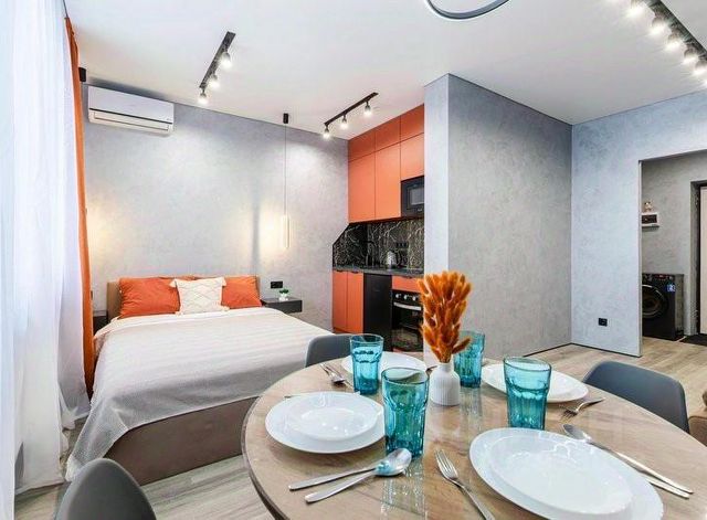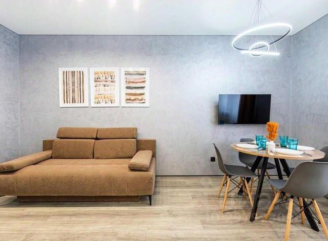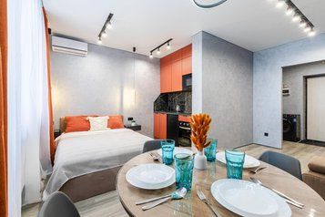 Уютная студия для комфортного проживания в современном ЖК, в 15 мин. от центра города. Имеется бесплатная парковка на придомовой территории. Закрытый двор, детская площадка. Рядом гипермаркет "SELGROS Cash&Carry". Размещение 1-4 человека. Двуспальная кровать и двуспальный диван. В наличии необходимая бытовая техника- холодильник, телевизор, электрическая плита, вытяжка, СВЧ, Чайник, утюг, фен. Гигиенические принадлежности.