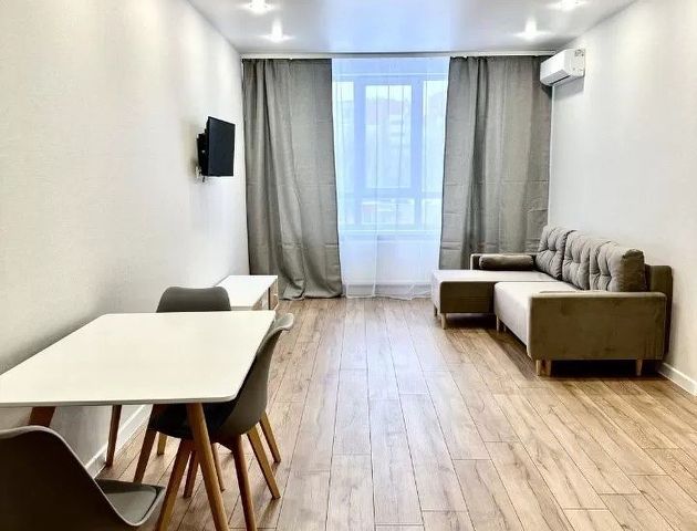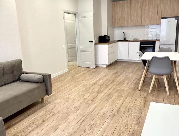 Сдается уютная квартира на длительный срок. В квартире выполнен свежий евро ремонт, что создает атмосферу уюта и комфорта. Просторная кухня площадью 15 м² оснащена всей необходимой техникой, включая холодильник и микроволновую печь. В гостиной установлен телевизор и удобный диван, а также обеденный стол с креслами. Из мебели в комнате шкафы и кровать. В спальне есть кондиционер и просторный шкаф. Санузел совмещенный, оборудован современной сантехникой и стиральной машиной. В прихожей предусмотрена гардеробная. Квартира расположена на третьем этаже кирпичного дома 2017 года постройки. Дом оснащен пассажирским и грузовым лифтами. Во дворе закрытая территория с спортивной площадкой и наземной многоуровневой парковкой.