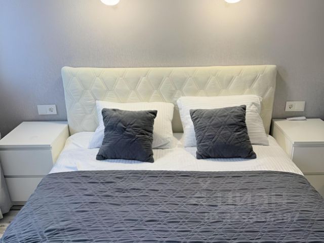 Квартира полностью меблирована. На кухне имеются встроенные: кухонный гарнитур, холодильник, газовая варочная панель, духовка, посудомоечная машина; микроволновая печь, телевизор, обеденный стол со стульями, посуда.